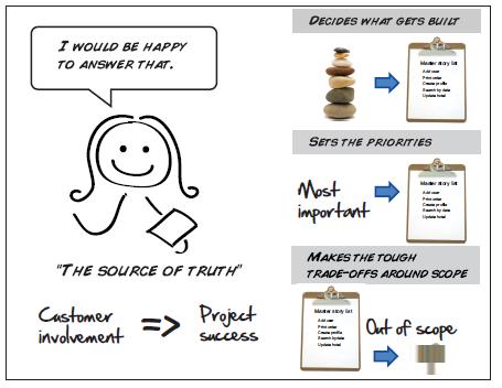 It’s someone closely familiar with the business, who really cares what the software does, what it looks like, and how it works, and who is committed to guiding the team, answering questions, and giving feedback. He also set the priorities (from the business point of view), decides what gets built and when.